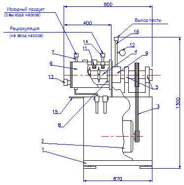 На основании (поз.1) установлен электродвигатель (поз.2), который через клиноременную передачу (поз.3) передает вращение на вал (поз.4), вращающийся в опорах (поз.5). Свободная часть вала снабжена радиально расположенными штырями. Эта часть вала входит в контейнер (сосуд) (поз.6). Контейнер имеет двойные стенки, в промежутке которых циркулирует вода. Для обеспечения нормальной работы блока (поз. 9) с двойным торцовым уплотнением, предусмотрен гидроаккумулятор (поз. 10). Гидроаккумулятор представляет собой герметичную вертикальную цилиндрическую емкость с внутренним змеевиком. В верхней части гидроаккумулятора предусмотрен штуцер для заливки запорной жидкости. В качестве запорной жидкости могут быть использованы дистиллированная вода, смесь воды и глицерина, уайт-спирит.